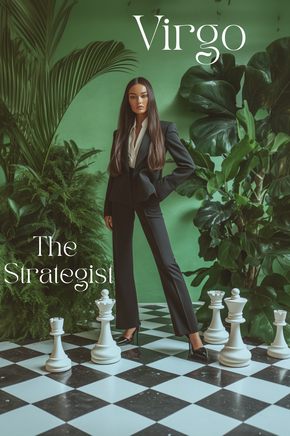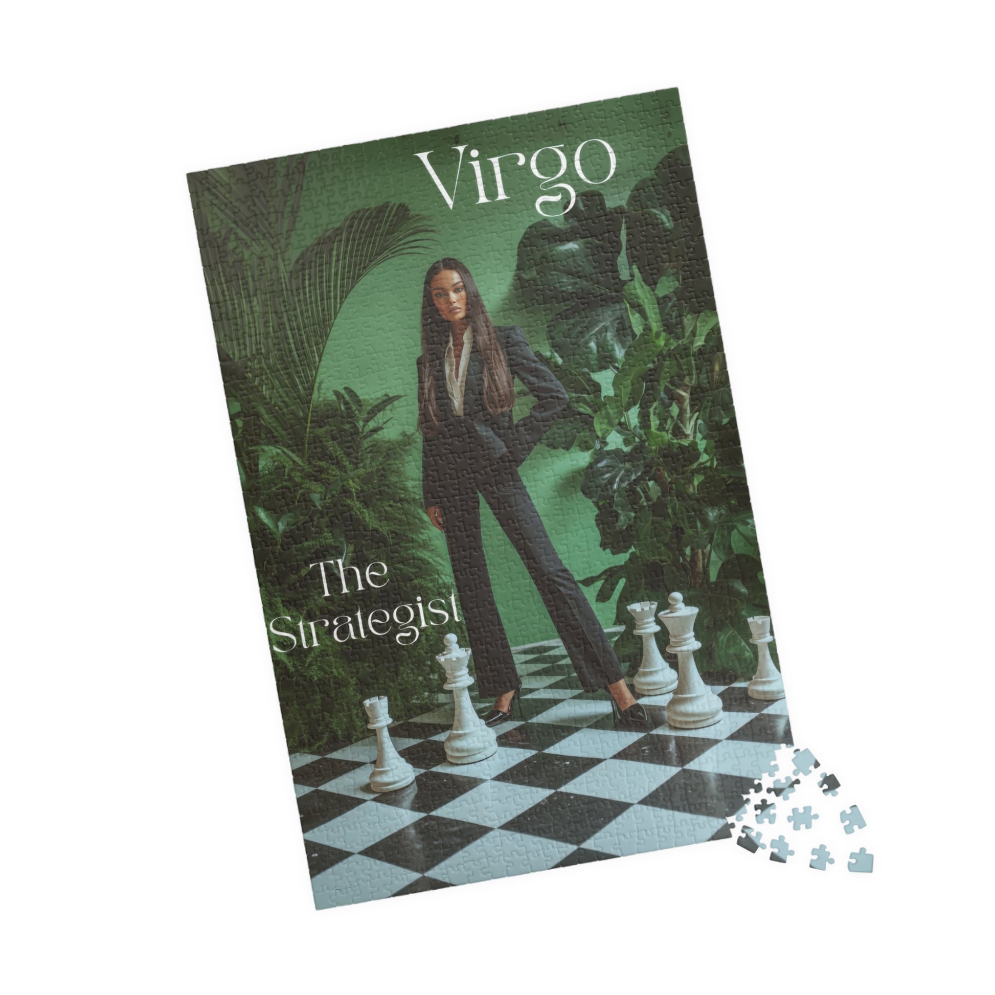 Calculated & cool. The Virgo jigsaw puzzle celebrates the zodiac’s sharpest mind with a visual ode to power, precision, and understated glamour. Centered on a poised figure in a tailored suit, standing on a life-size chessboard surrounded by lush greenery, this luxury jigsaw puzzle is equal parts elegance and intellect. Clean lines, earthy tones, and structured beauty make it a must for lovers of classic design and zodiac symbolism.