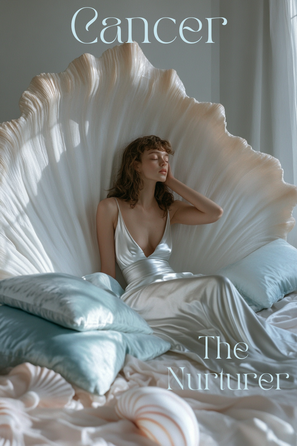 Where softness meets strength. The Cancer jigsaw puzzle captures a moment of calm luxury—a woman draped in satin, curled into a seashell-shaped bed, surrounded by seafoam pillows and a glow of morning light. It’s tender, romantic, and a little nostalgic—just like the most intuitive sign in the zodiac.