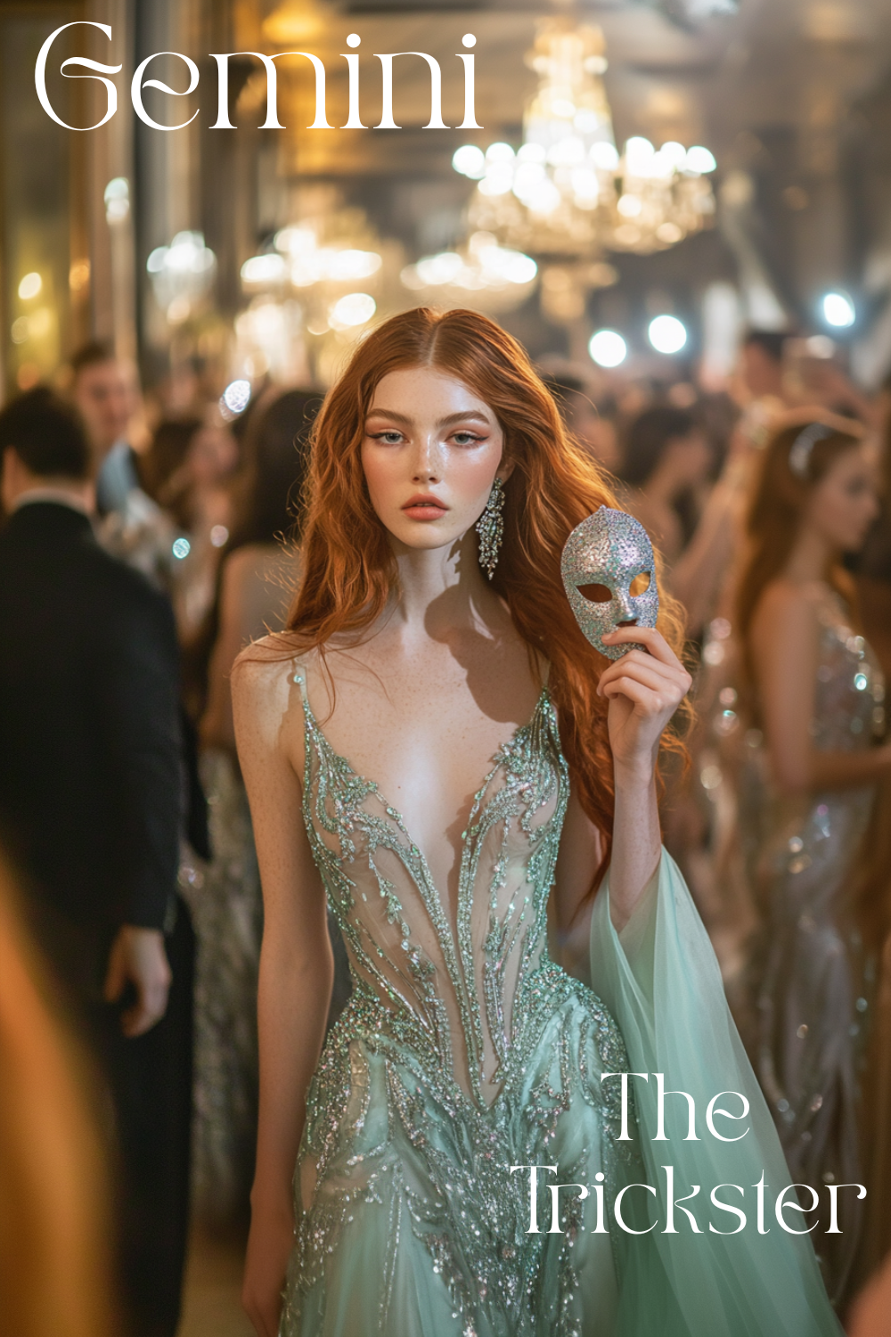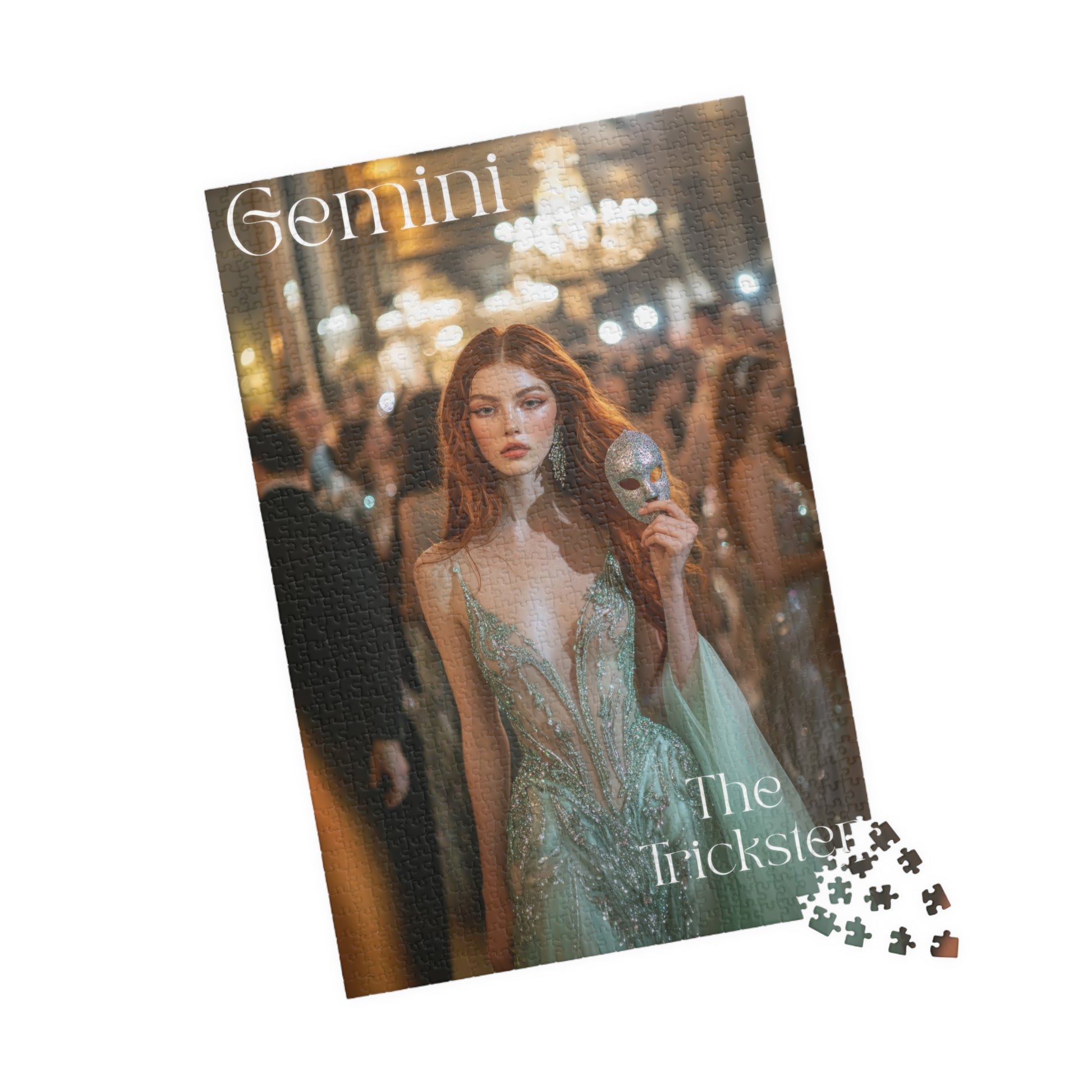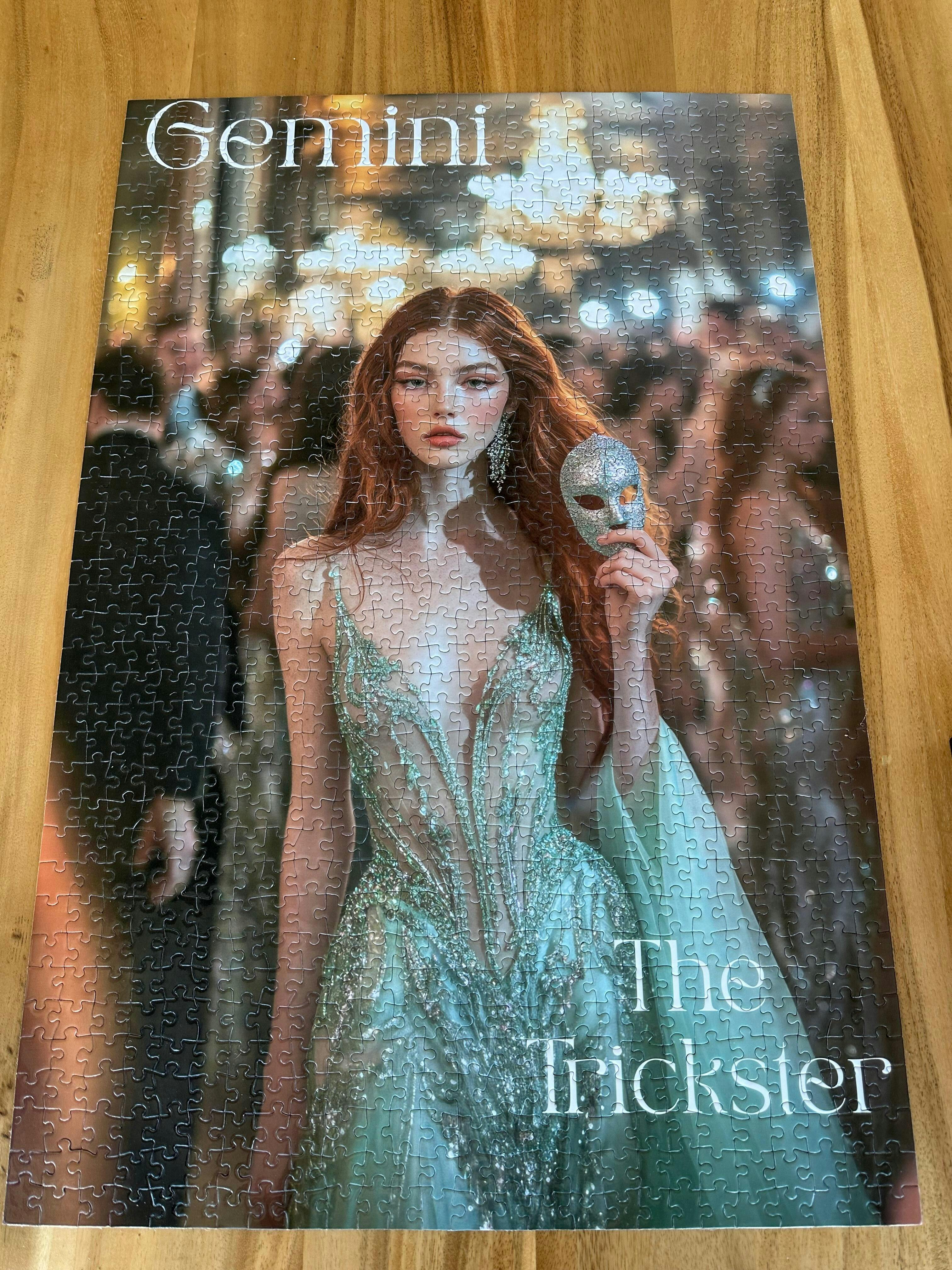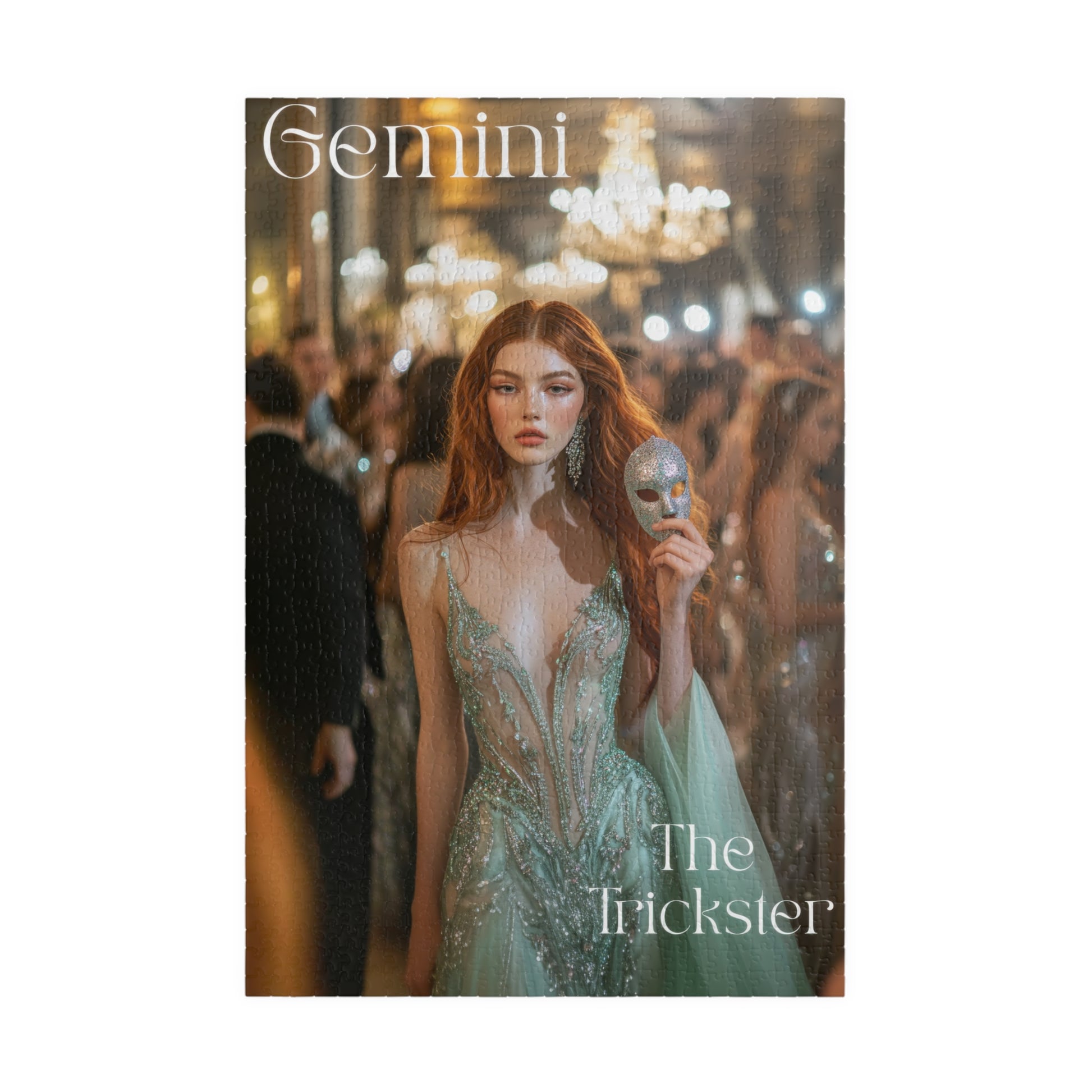 One face for the crowd, another for the night. The Gemini jigsaw puzzle captures the magnetic duality of the zodiac’s most elusive sign—poised between elegance and enigma. Set at a lavish masquerade, our red-haired muse stuns in a seafoam beaded gown, holding a sparkling mask that hints at the other side. Charming, clever, and just a little unpredictable—this one’s full of secrets.